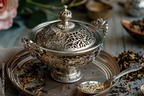 Elegant silver tea caddy with intricate designs on a rustic wooden table