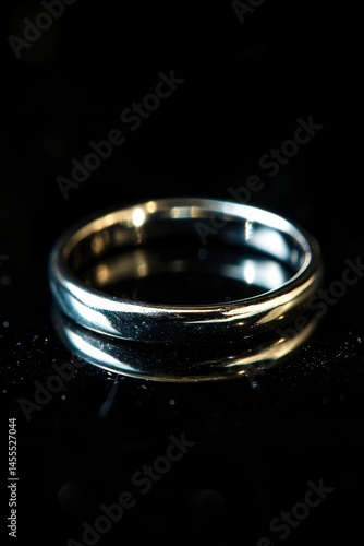 Elegant Silver Wedding Band on Black Reflective Surface in Dramatic Lighting Style
