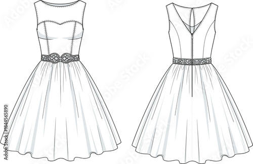 Elegant sleeveless dress fashion illustration, technical garment sketch, sheer neckline, ornamental belt, pleated flared skirt, front and back view, vector template