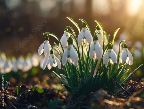 Elegant snowdrop blooms gracefully emerge, signaling the arrival of spring with pristine white petals in soft, golden sunlight.