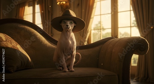 Elegant Sphynx Cat Wearing Brown Hat Sitting on Vintage Chaise Lounge