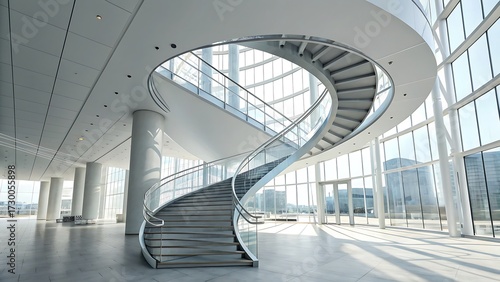 Elegant spiral staircase with glass railings in a bright, airy building featuring large windows and minimalist architectural design.