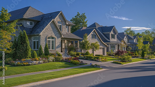 Elegant stone houses with lush gardens line peaceful suburban street