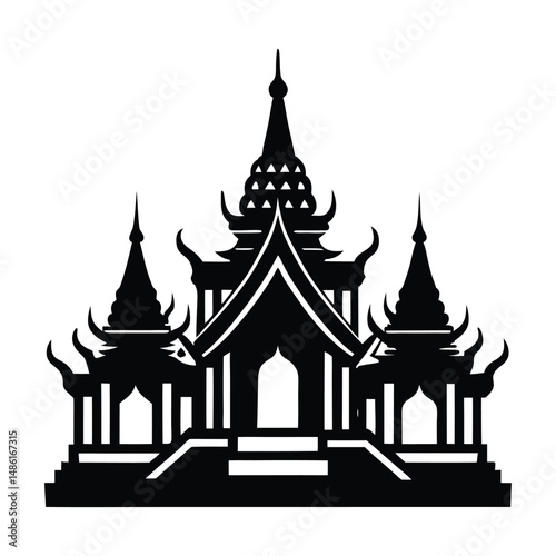 Elegant Thai Temple Architecture Black and White Vector Illustration