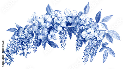 Elegant Toile de Jouy Blue Illustration of Wisteria Bouquet