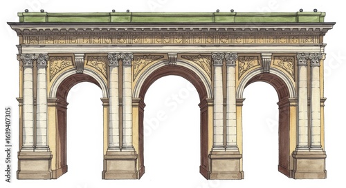 Elegant Triple Archway Architectural Design - Classic architecture, elegant design, ornate detailing, triple arch structure, historical inspiration.