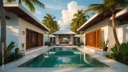 Elegant tropical luxury beachfront home showcasing a beautiful pool surrounded by lush greenery and palm trees with stunning ocean views in a relaxing tropical paradise