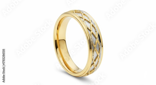 Elegant two-tone wedding band featuring intricate woven detailing around the circumference