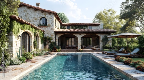 Elegant villa terrace with rustic stone walls, soft woven textures, and an inviting outdoor pool, 3D rendering, 8K