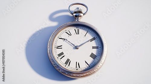 Elegant vintage pocket watch with ornate silver case and roman numerals captured from above against a minimalist white background
