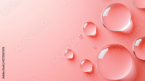 Elegant Water Droplets on Pink: A collection of clear, spherical water droplets rests elegantly on a soft pink surface, each glistening with a subtle luminosity.