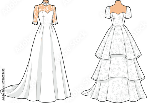 Elegant wedding dresses vector illustration featuring intricate lace and layered designs, perfect for bridal fashion, wedding gown design, formal wear, and fashion illustration.