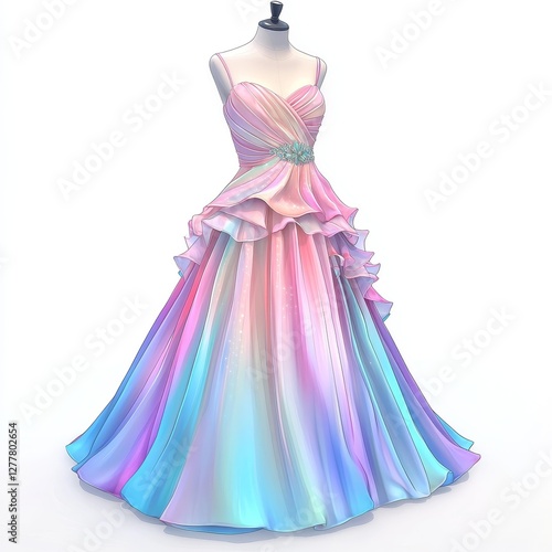 Elegant wedding gown design featuring colorful gradient fabric on showcasing ruffled layers and intricate details for bridal fashion enthusiasts