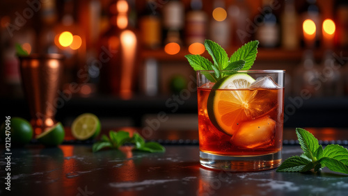 Elegant Whiskey Cocktail on Dark Bar Counter, Warm Moody Atmosphere