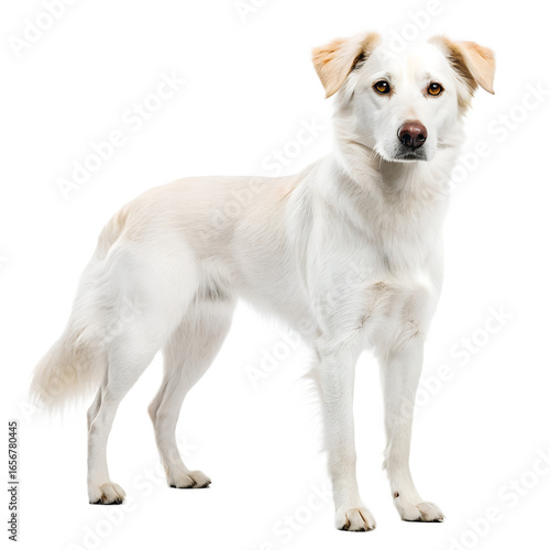 Elegant White Dog Standing Gracefully Against a Stark Black Backdrop With Alert Expression and Relaxed Posture Captured in Studio Lighting