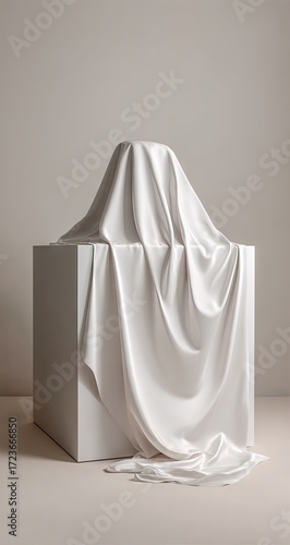 Elegant white fabric draped over a minimalist cube pedestal.
