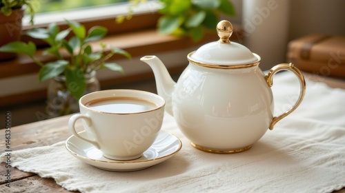 Elegant white teapot with golden accents beside a delicate tea cup on a rustic wooden table with greenery