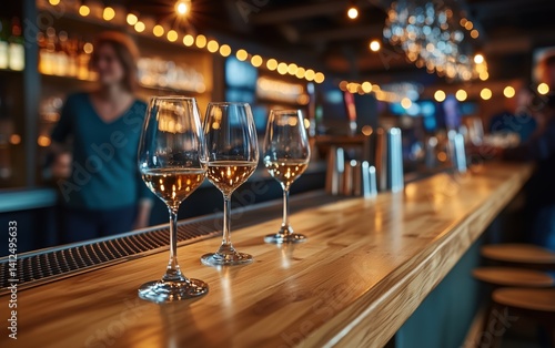 Elegant Wine Glasses on a Wooden Bar Counter in a Stylish Restaurant