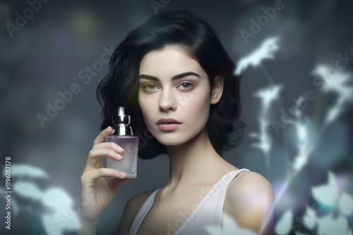 Elegant woman holding perfume bottle