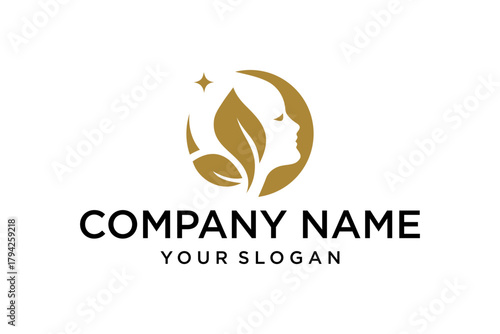 Elegant Woman Profile and Organic Leaves Golden Logo Design