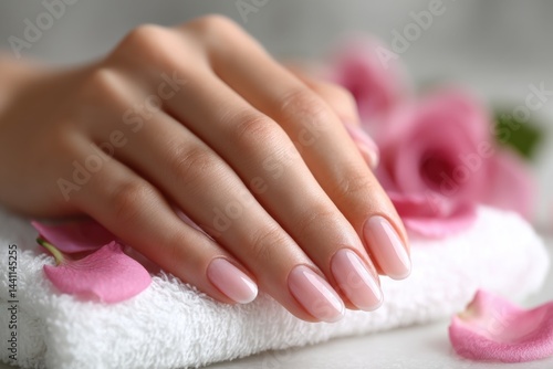 Elegant woman's hand with a fresh manicure resting on a soft towel, surrounded by delicate pink roses for a spa and beauty concept photoshoot.