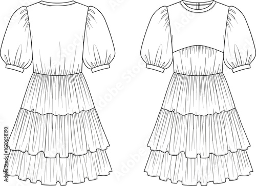 Elegant Women's Long-Sleeved Dress with High Ruffled Collar, Smocked Waistband, and Puffed Sleeves - Fashion Vector Technical Sketch.