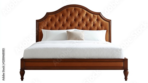 Elegant wooden bed with a tufted leather headboard and plush white bedding, offering a classic touch to a bedroom.