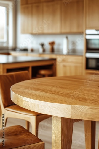 Elegant wooden dining table in a bright modern kitchen with soft lighting and a minimalist design style providing a warm and inviting atmosphere
