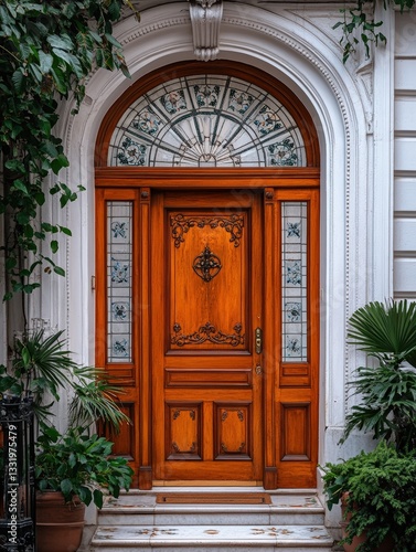Elegant wooden double doors with ornate glass panels framed by white walls and greenery, refined entrance in bright architectural style, copy space