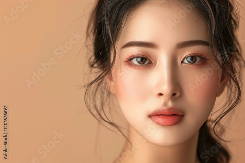 Elegant young asian woman with striking makeup and a bun hairstyle.