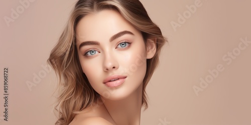 Elegant young woman with blonde hair, blue eyes, and natural makeup. She poses gracefully against a soft beige background, highlighting her flawless skin and serene expression