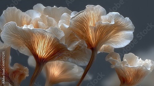 Elegantly Captured Still Life of Oyster Mushrooms with Textured Caps and Prominent Ridges Emphasized by Soft Natural Lighting in a Balanced Composition