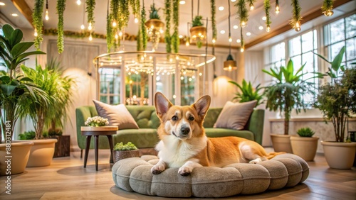 Elegantly designed pet hotel interior features plush dog bed, calming spa area, and luxurious amenities for canine comfort and relaxation.