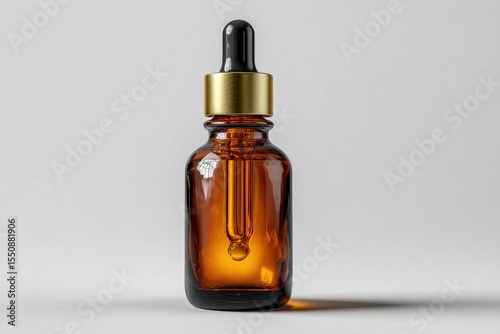 Elegantly minimalist dark amber glass dropper bottle on a white background, exuding beauty and sophistication in a serene setting