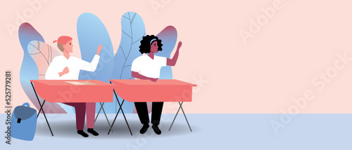 Elementary school students in classroom at school, flat vector stock illustration with leaves or copy space template for design