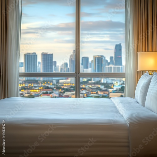 Elevated bedroom view of a city skyline.