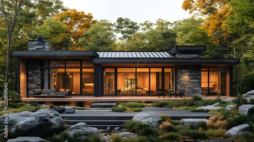 Elevated countryside home with black steel frame, wooden accents, metal roofing, open ground level, warm tones, surrounded by nature, 8K high-resolution realistic images,