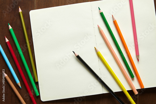 Eleven colored pencils and an empty sketchbook on a wooden table