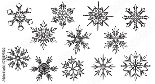 Eleven intricately designed black outline snowflakes with distinct geometric patterns in a variety of symmetrical shapes.