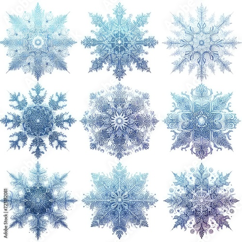 Eleven snowflakes, each a masterpiece of intricate design and symmetry, float gently against a white backdrop. Their blue tones, ranging from light to dark, capture the essence of a frosty winter’s da