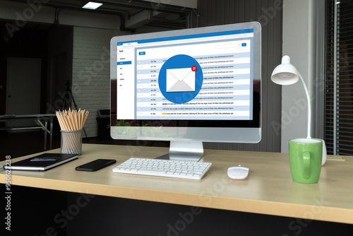 Email notification message showing on computer screen snugly. Digital marketing message information text from business to customer client
