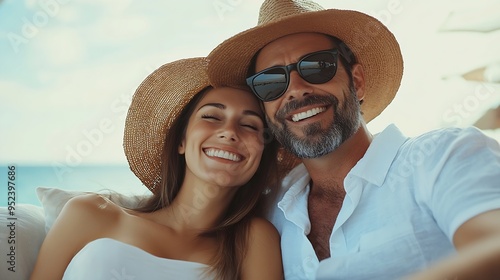 Embrace relax and couple on hotel terrace with smile love and tropical holiday fun together Laughing man and happy woman on outdoor couch with hug cozy romance and date on calm travel : Generative AI