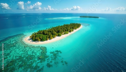 Emerald isles, turquoise waters, aerial panorama, trees, tropical