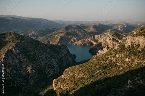 Emerald lake on the bottom of the ancient valley covered with green forest on the sunset in Spain