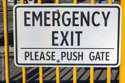 Emergency exit sign. Exterior, exit sign on a gate on a street