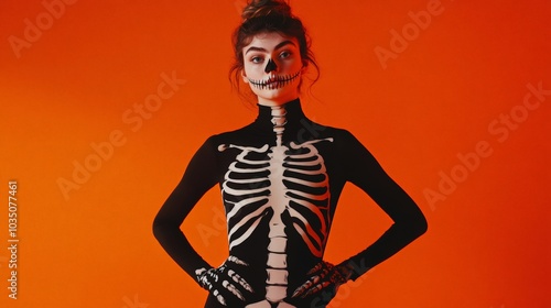Emma in Skeleton Costume Against Vibrant Background