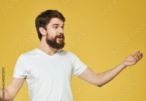 emotional bearded man in white t-shirt yellow background