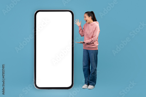 Emotional chinese woman looking at smartphone empty screen
