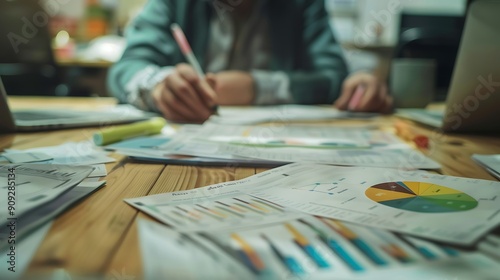 employees discussing statistics at a work table with documents