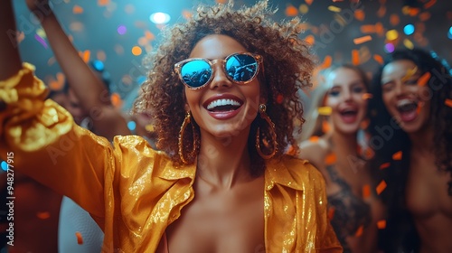 Employees of different backgrounds dancing and enjoying themselves at a company party in a contemporary office, celebrating their business success.
